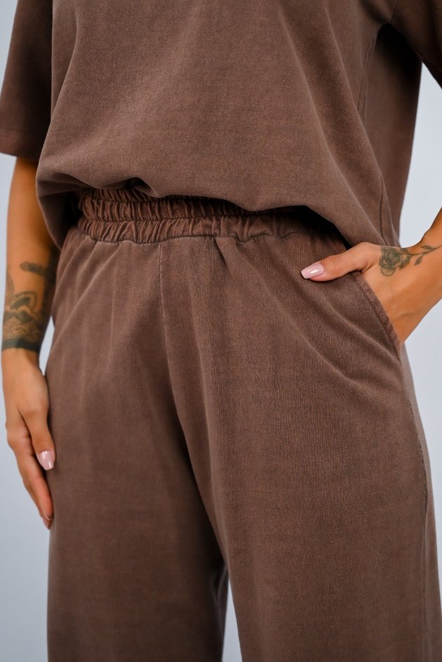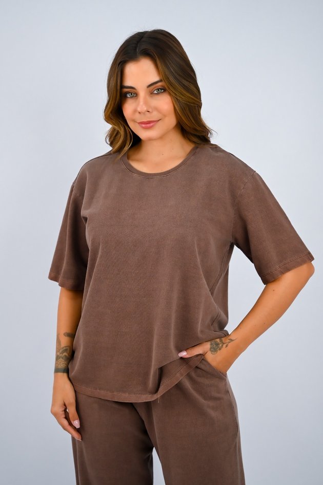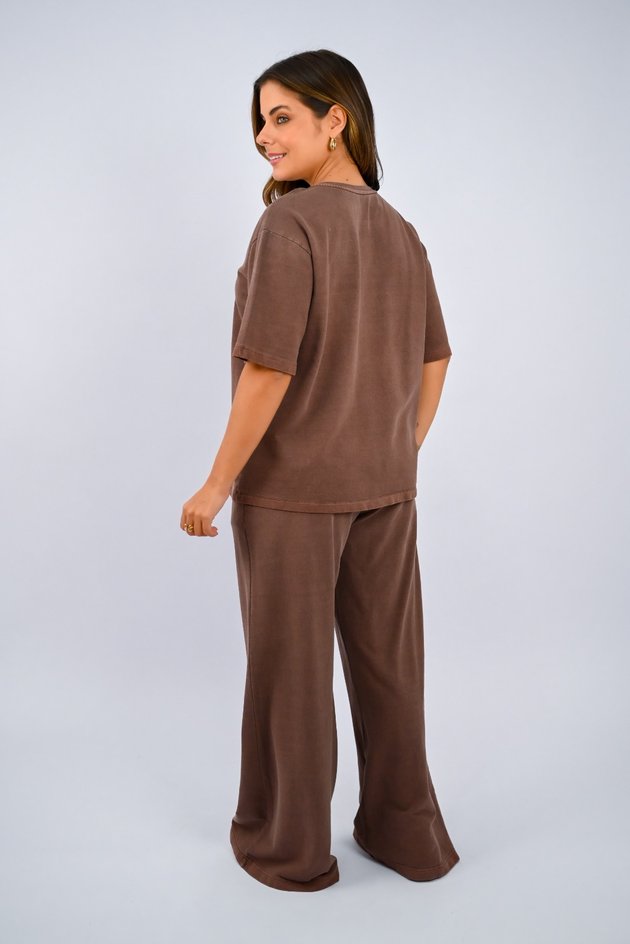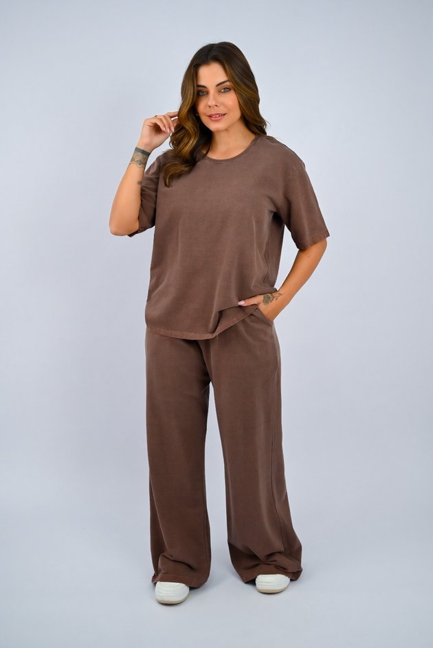 A calça wide leg, também 100% algodão moletinho, completa o conjunto com sua modelagem ampla e confortável. Com elástico na cintura e bolsos laterais, ela segue o mesmo estilo estonado, oferecendo um visual descontraído e leve. Sem estampas, é uma peça prática que proporciona liberdade de movimento e muito conforto, perfeita para quem aprecia um visual moderno e descomplicado. Juntas, essas peças são ideais para quem busca um look casual e cheio de personalidade.